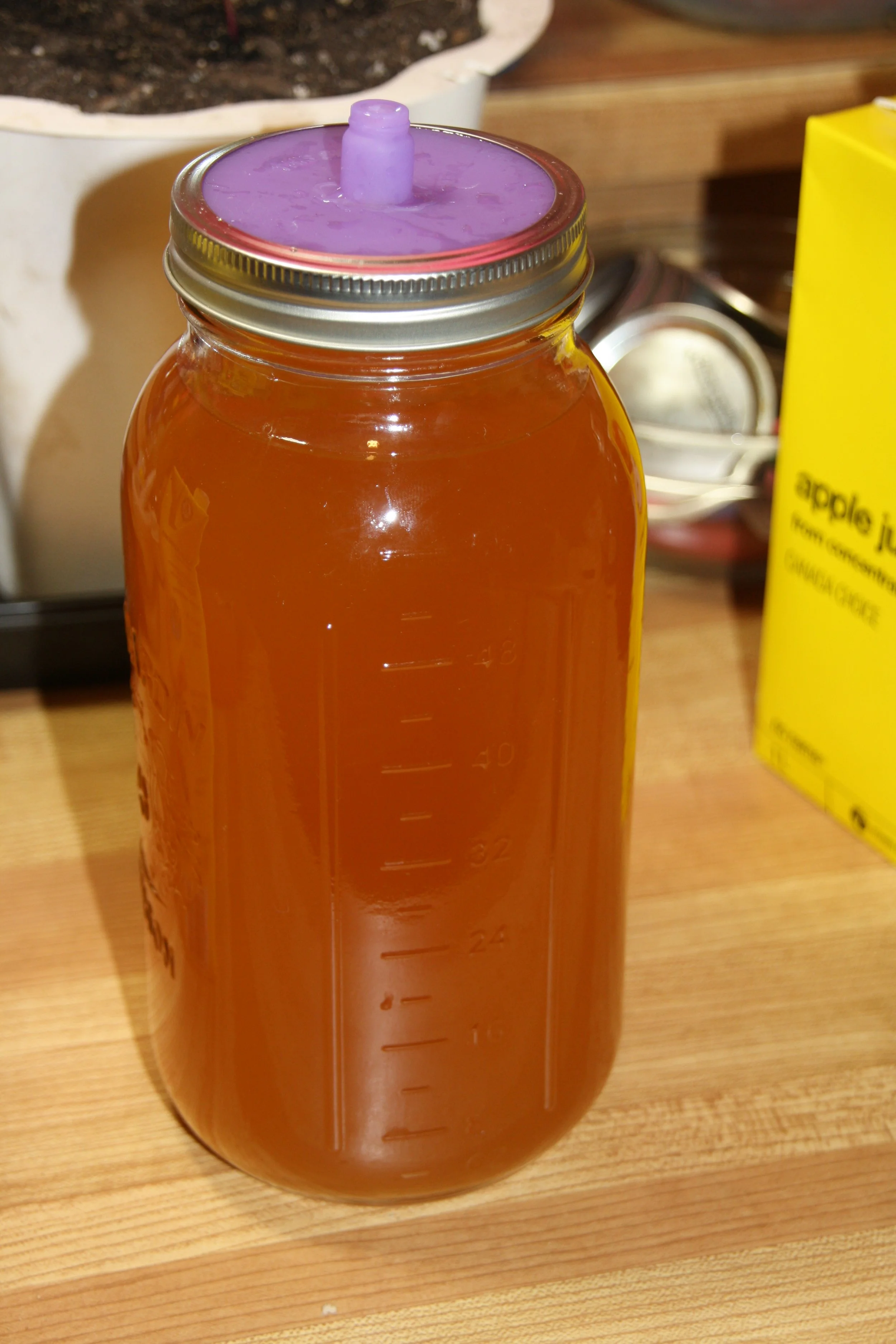 Step 3: slowly pour the applejuice into the mason jar, stopping to swirl the yeast mixture a few times to help exsure it is properly mixed. Fill the jar to the point where the shoulders curve up into the neck of the jar. You don’t want to go any higher than this, so there is space left in the jar for the bubbling.